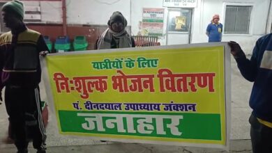 देर से चल रही ट्रेनें, जनरल कोच के यात्रियों के रात में गर्मागर्म खिचड़ी बांट रहे जनआहार के कर्मचारी