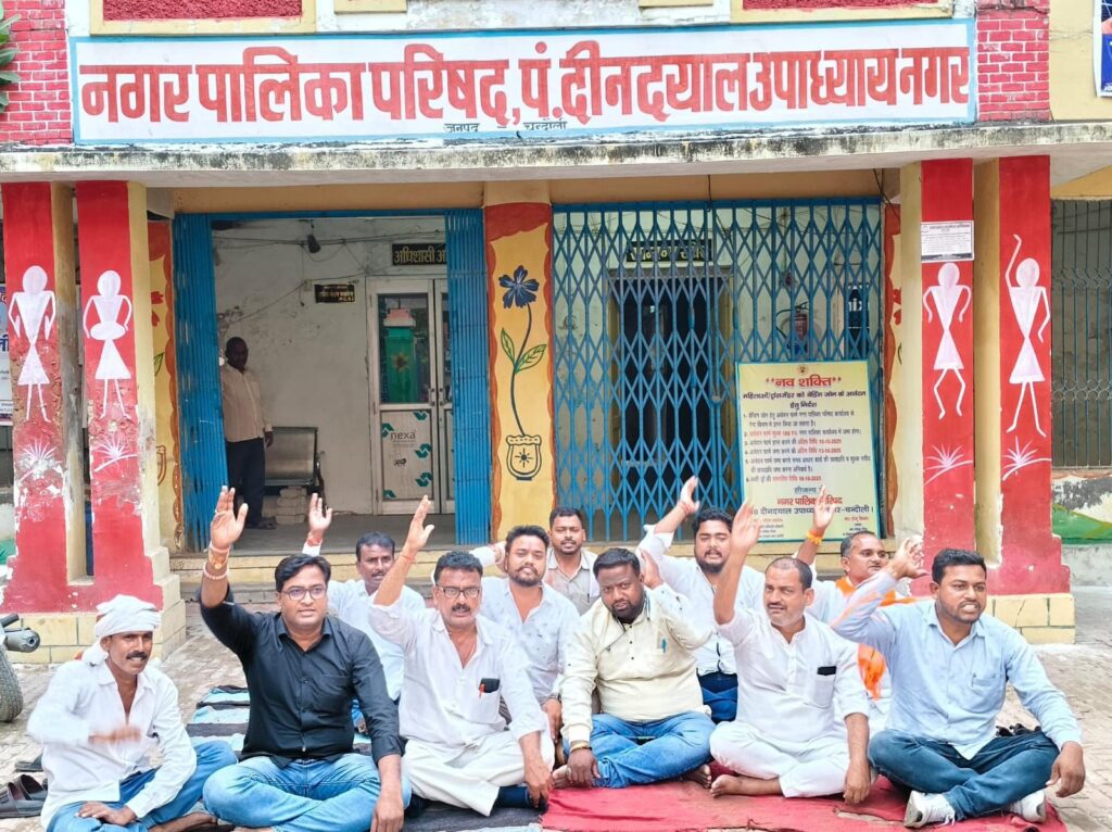 NEWS GUURU पीडीडीयू नगर : नगर पालिका कार्यालय परिसर में सोमवार की शाम सभासद विभिन्न मुद्दो को लेकर बैठ गये। सभासदों ने ईओ और सफाई निरीक्षक पर मनमाने तरीके से कार्य करने का आरोप लगाते हुए नारेबाजी की। सभासदों ने आरोप लगाया कि एक तरफ जहां दीपावली का पर्व नजदीक है वहीं दूसरी तरफ आउटसोर्सिंग कर्मचारियों को अभी तक तनख्वाह नहीं मिली है। वहीं दूसरी तरफ पहले से ही क्षेत्र में सफाई व्यवस्था का बुरा हाल है वहीं सभी वार्ड से सफाईकर्मियों की कटौती कर उनसे डोर टू डोर कूड़ा कलेक्शन कराने की तैयारी की जा रही है। जबकि बोर्ड ने 50 कर्मचारियों को अलग से रखने का प्रस्ताव पास किया था। सभासदों ने कहा कि जब तक उनकी मांगें पूरी नहीं हो जाती तब तक धरने पर बैठे रहेंगे।